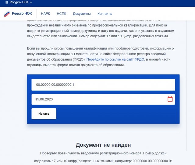 Проверка действительности через реестр НОК по номеру и дате выдачи